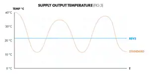 Super stabiele output (aanvoer) temperatuur. Bij de RevomaxII zal tijdens ontvochtigen ‘s nachts of overdag de uitgangstemperatuur maximaal 0,4°C fluctueren (fig 3). De temperatuurschommeling van de PRO4 kan oplopen tot 40°C en zo laag als 10°C, afhankelijk van de binnentemperatuur. Voor veel toepassingen en plantensoorten is dit erg belangrijk. Bij groene groenten zoals sla en kruiden bijvoorbeeld, leiden hoge temperatuurschommelingen in de productie tot gestresste planten. Hoe stabieler de uitgangstemperatuur, hoe minder stress voor de planten. Door deze nieuwe functie kan de unit nu voor een veel grotere verscheidenheid aan toepassingen en installaties worden gebruikt.