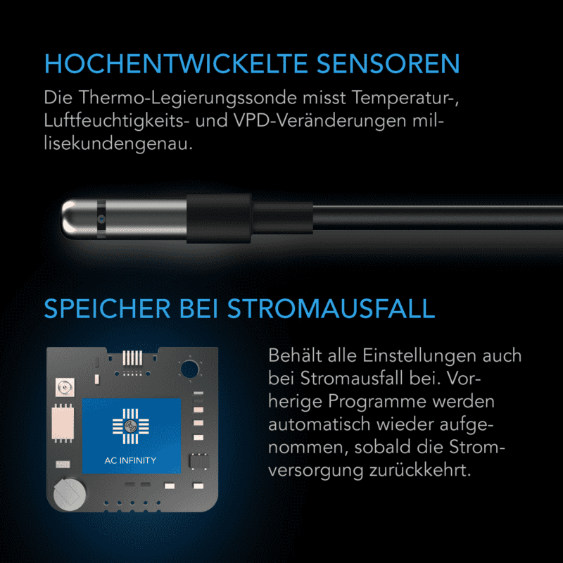 De Controller 69 PRO past de snelheid van ventilatoren en de intensiteit van kweeklampen automatisch aan op basis van temperatuur, luchtvochtigheid en VPD. Hierdoor blijft het klimaat constant, zelfs bij wisselende omstandigheden. Het verlichte display toont alle waarden in °C of °F en kan worden uitgeschakeld om het nachtregime van planten niet te verstoren.