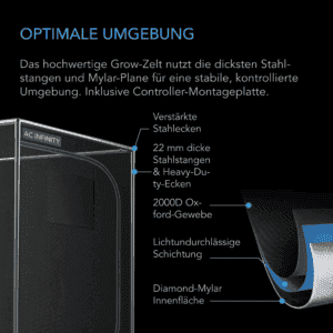 Het CLOUDLAB 733 kweektentframe bestaat uit 22 mm stalen buizen en kan tot 68 kg apparatuur dragen. De dikke Oxford buitenlaag is volledig lichtdicht en de Mylar binnenlaag reflecteert licht voor maximale efficiëntie. Het zichtvenster (30 x 30 cm) laat je de groei monitoren zonder het klimaat te verstoren. Alle openingen zijn dubbel afsluitbaar en geschikt voor ventilatie en bekabeling.