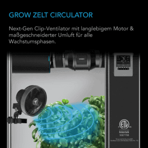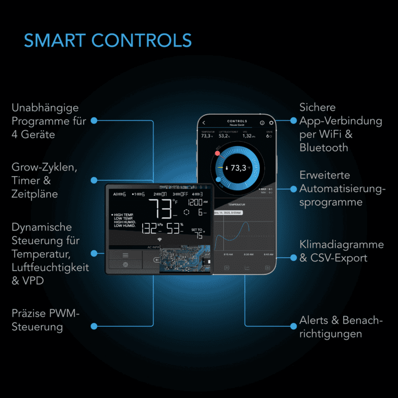 Het hart van dit systeem is de CONTROLLER 69 PRO. Deze centrale regelunit stuurt alle aangesloten apparaten dynamisch aan: de inline-buisventilator, de clipventilator en de LED. De controller gebruikt VPD (Vapor Pressure Deficit), temperatuur en luchtvochtigheid als basiswaarden om automatisch de ideale instellingen te kiezen. Ook biedt hij uitgebreide timer-, cyclus- en schemaopties. Via de AC Infinity app beheer je alle functies op afstand, inclusief meldingen, grafieken en klimaathistorie.
