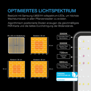 De IONBOARD S33 260 W LED-kweeklamp maakt gebruik van Samsung LM301H diodes, bekend om hun hoge efficiëntie en optimale lichtspreiding. Het spectrum is ontworpen om natuurlijk zonlicht te simuleren, wat gezonde groei en hogere opbrengsten bevordert. De brede lichtverdeling zorgt voor een gelijkmatige belichting over de volledige 90 x 90 cm footprint.