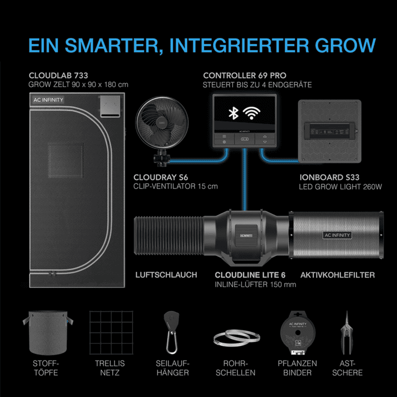 AC InfinityAC Infinity kweektentsysteem 90×90×180 met slimme CONTROLLER 69 PRO, 150 mm inline-buisventilator, koolstoffilter, LM301H LED en premium CLOUDLAB tent. Compleet plug-and-play systeem voor gecontroleerde binnenteelt van 3 planten.