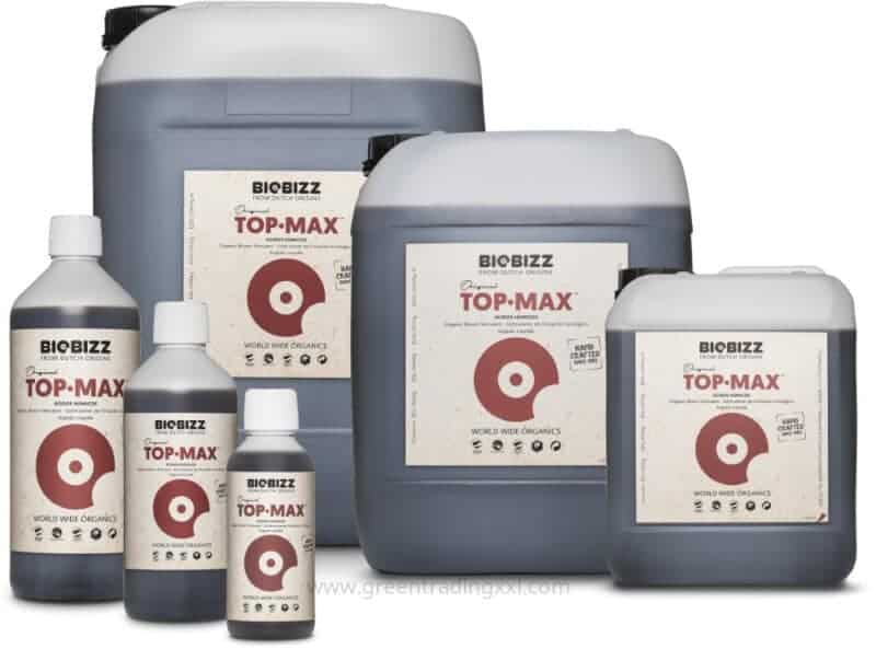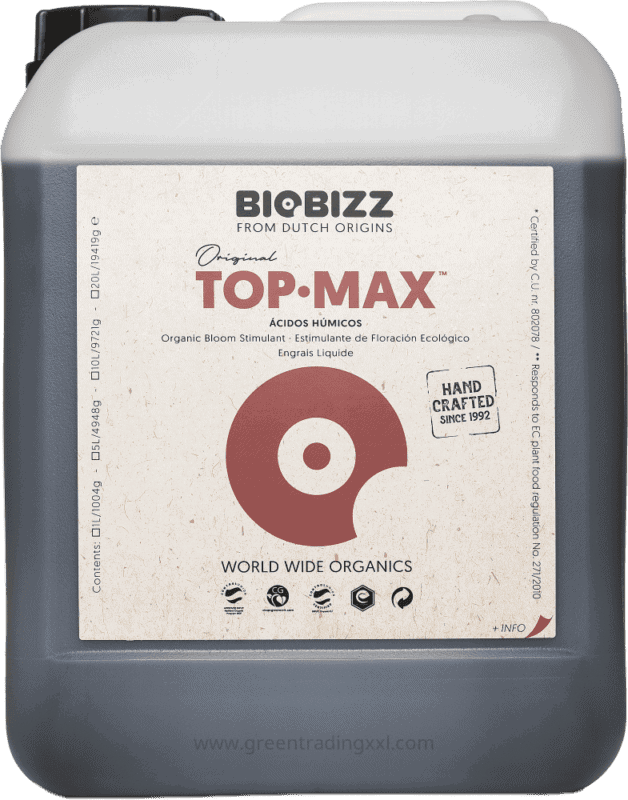 Biobizz Top-Max is een volledig biologische, 100% plantaardige bloeistimulator die speciaal ontwikkeld is om de bloeifase van planten naar een hoger niveau te tillen. Deze krachtige formule stimuleert de aanmaak van bloemcellen en bevordert de productie en het transport van suikermoleculen naar de bloemen. Dit resulteert uiteindelijk in grotere vruchten en een zachte, zoete smaak van het eindproduct.