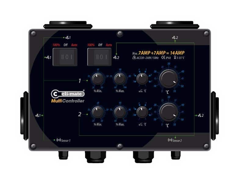 Cli-MateDe Multi-Controller MC-serie, is een temperatuur gestuurde, Plug and Play, elektronische traploze analoge toerenregelaar. De MC-serie is voorzien van 4 ingebouwde aansluitpunten. D.m.v. 2 voorgemonteerde temperatuursensoren, regelt de MC-serie geheel automatisch uw binnenklimaat.