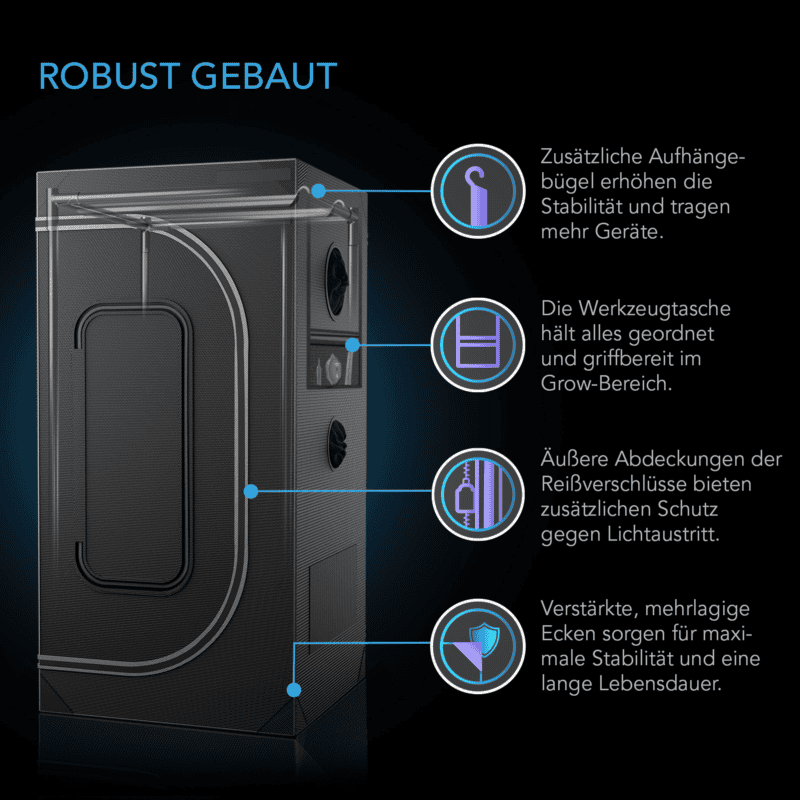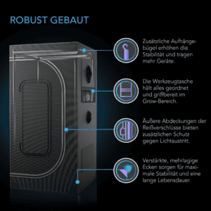 Der Rahmen besteht aus verstärkten Stahlrohren mit 22 mm Durchmesser und ist damit deutlich stabiler als herkömmliche 18 mm Growzeltgestänge. Die drei mitgelieferten Aufhängestangen tragen zusammen bis zu 113,4 kg – perfekt für schwere LED-Growlights, Aktivkohlefilter und Belüftungssysteme. Das 2000D Oxford-Material ist besonders reißfest und vollständig lichtdicht. Verstärkte Ecken, eine robuste Bodenwanne und ritzüberdeckende Lichtschutzklappen erhöhen die Haltbarkeit und verhindern zuverlässig Lichtaustritt.
