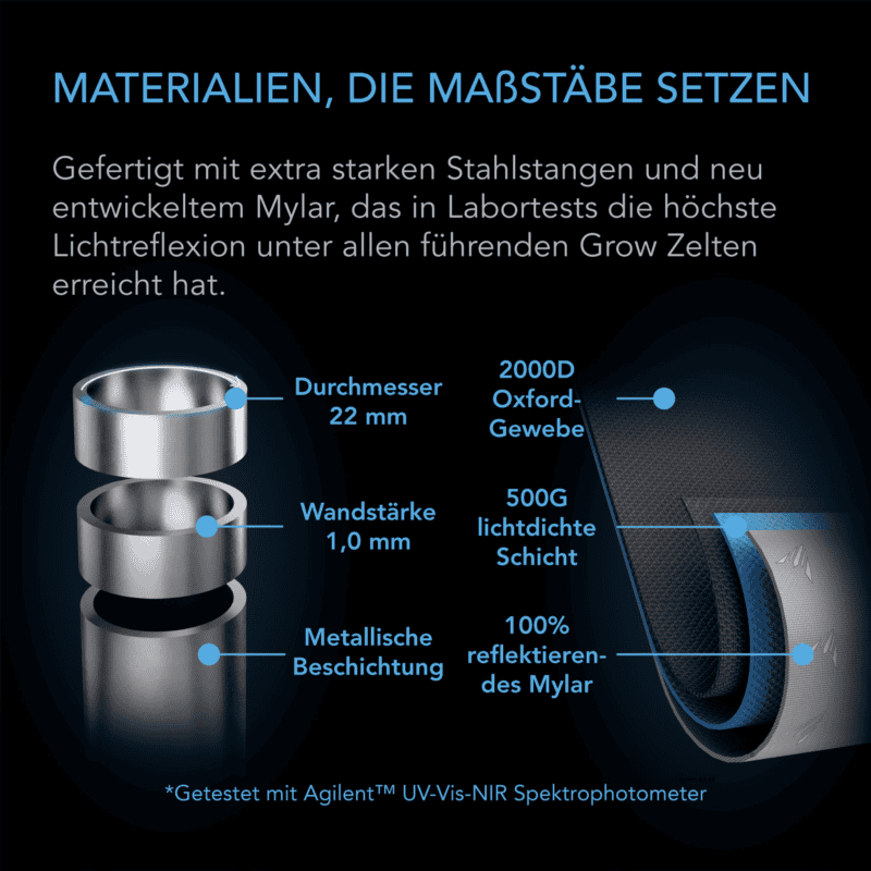 Die Innenwände sind mit Diamond-Mylar beschichtet, das laborgeprüft mit einem Agilent UV-Vis-NIR Spektrophotometer höchstmögliche Reflexionswerte erzielt. Die hohe Lichtreflexion steigert die Effizienz der Beleuchtung, sorgt für eine gleichmäßige Lichtverteilung und fördert ein kräftiges Pflanzenwachstum. Dadurch entsteht eine optimale Lichtnutzung ohne Verluste.