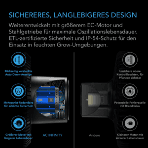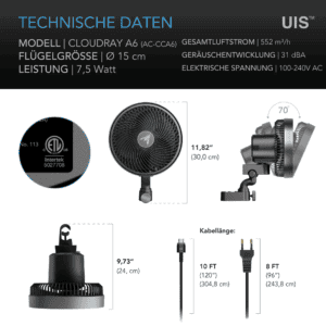 Als Teil des AC Infinity UIS-Systems lässt sich der CLOUDRAY A6 mit geeigneten Controllern verbinden und über die WLAN-App steuern. Klimaabhängige Trigger, Timer und Automatisierungen ermöglichen eine vollständig optimierte Umgebung. Der Ventilator erfüllt CE- und ETL-Sicherheitsstandards und ist zuverlässig für den Dauereinsatz in feuchten Wachstumsumgebungen.