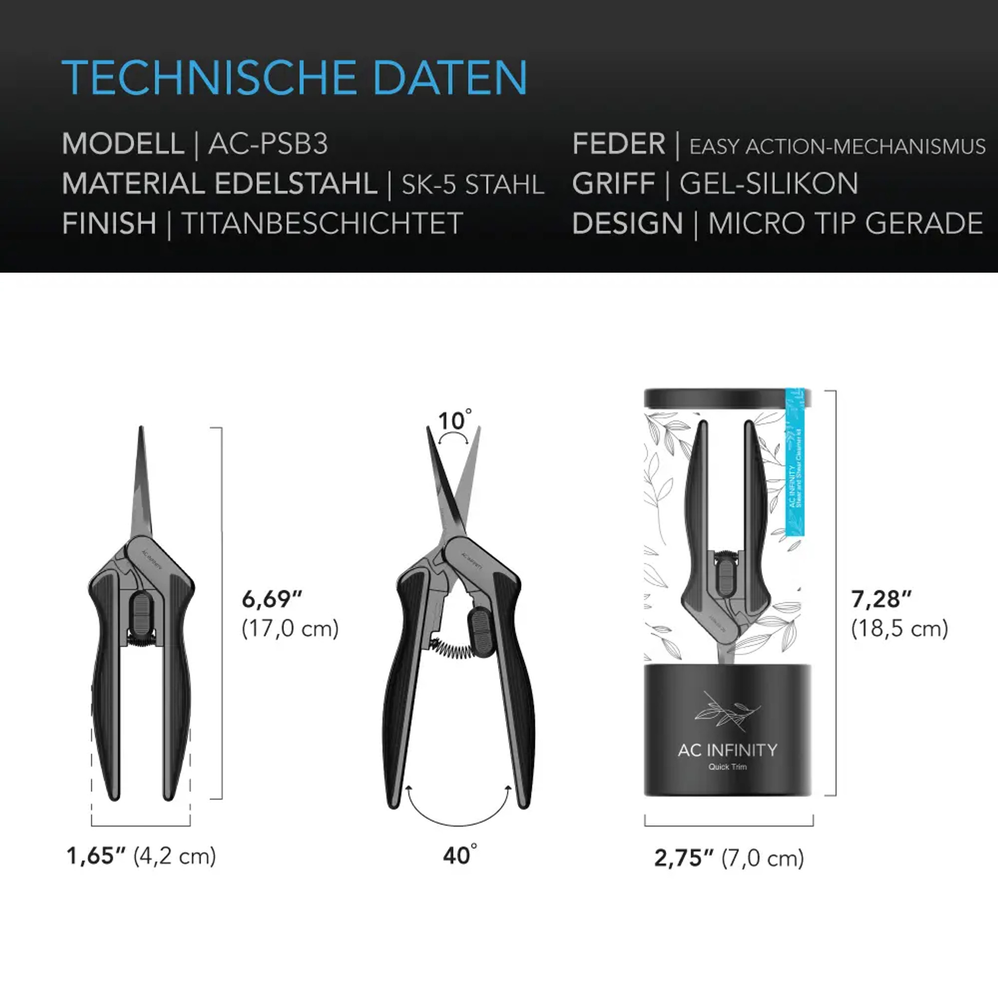 AC InfinityAC Infinity Edelstahlschere mit geraden Mikrospitzen und Titanbeschichtung. Leicht, ergonomisch und ideal für präzise Pflanzenschnitte. Inklusive Reinigungskit für einfache Pflege.