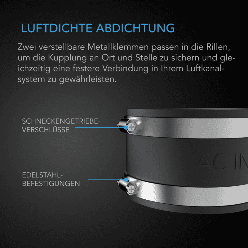 Die flexible Konstruktion macht die Installation einfach und schnell. Die Manschette gleitet mühelos über die Luftkanalanschlüsse, wonach du sie mit den verstellbaren Edelstahl-Schneckengetriebeschellen fest fixierst.