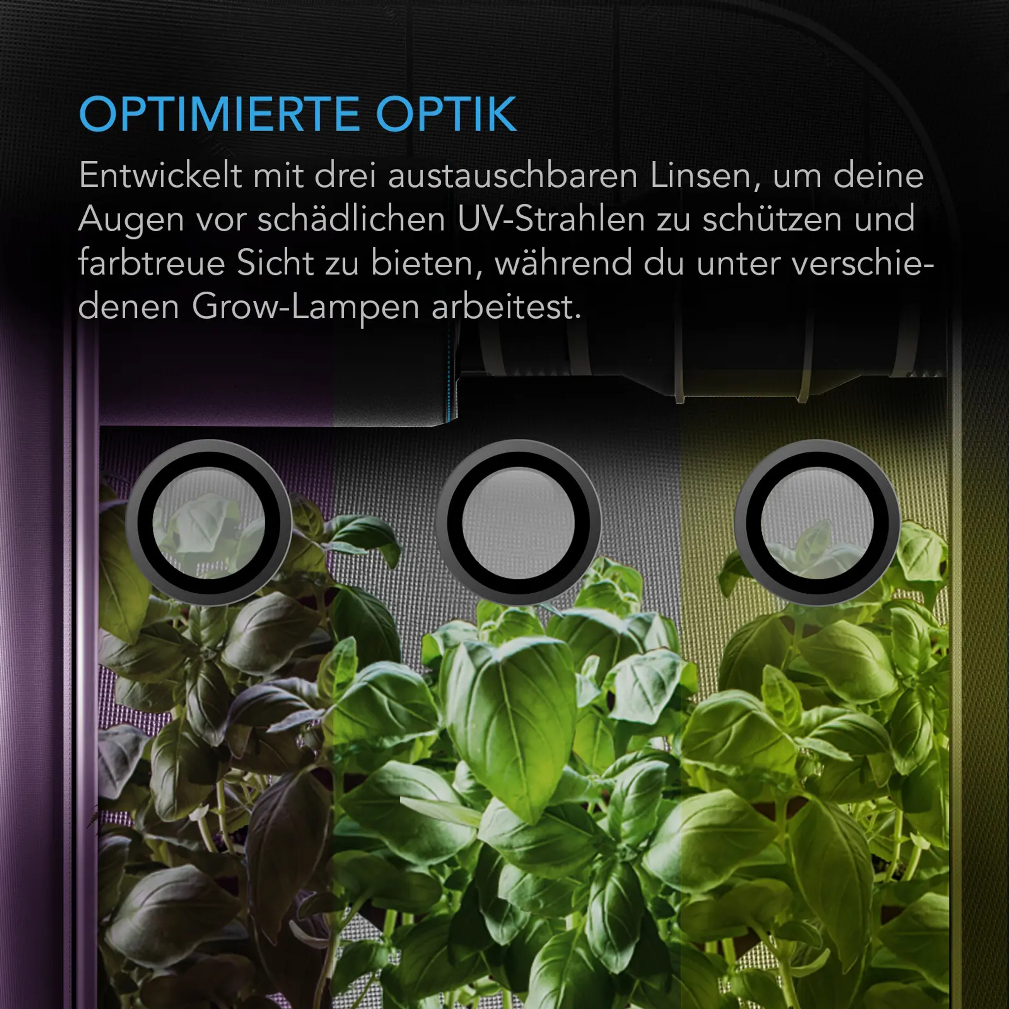 Die Brille wird mit drei wechselbaren Gläsern geliefert, die speziell darauf ausgelegt sind, verschiedene Arten von Pflanzenbeleuchtung zu neutralisieren. Dadurch siehst du deine Pflanzen in ihren natürlichen Farben, was für eine genaue Inspektion von Gesundheit und Wachstum unerlässlich ist.