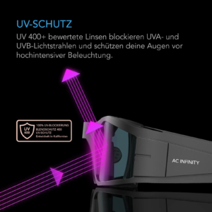 Die AC Infinity Growroom-Brille wurde speziell entwickelt, um deine Augen bei der Arbeit unter leistungsstarken Growlampen zu schützen. Dank UV 400+-Schutz werden schädliche UVA- und UVB-Strahlen effektiv blockiert, wodurch Ermüdung und Reizung der Augen stark reduziert werden. Ideal für den Langzeiteinsatz in Indoor- und Outdoor-Anbauumgebungen.