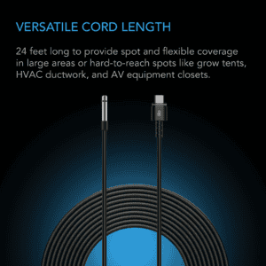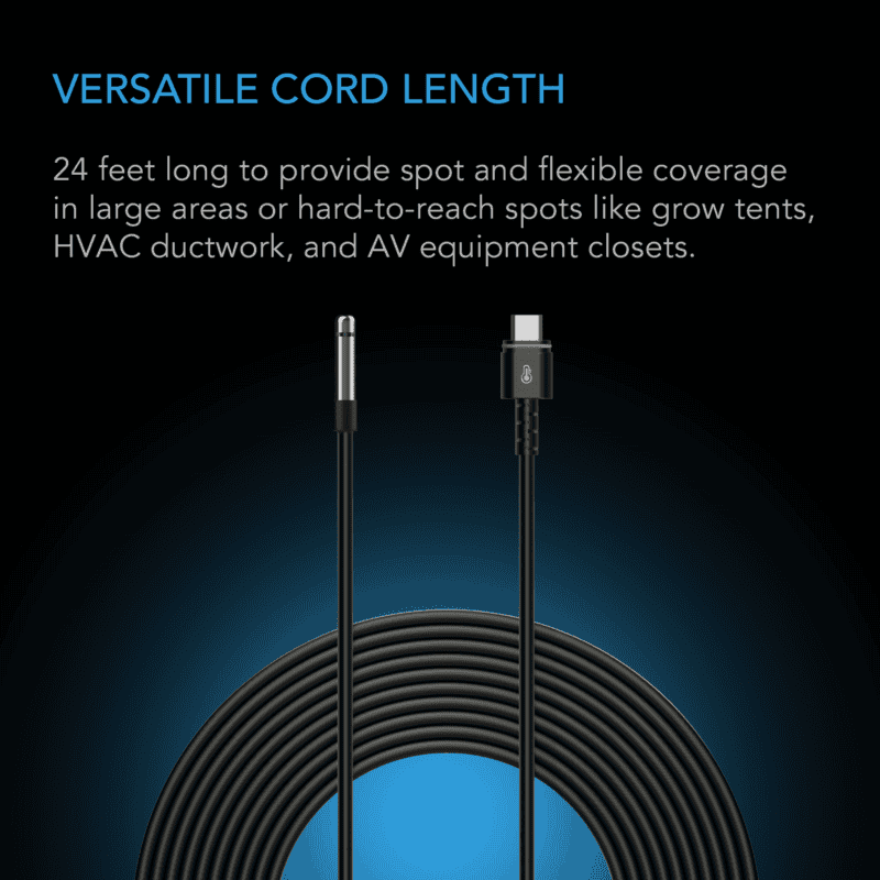 Mit einer Kabellänge von 6 m lässt sich der Sensor exakt dort platzieren, wo präzise Messungen erforderlich sind, beispielsweise in größeren Growzelten, Lüftungskanälen oder Werkzeug- und AV-Schränken.