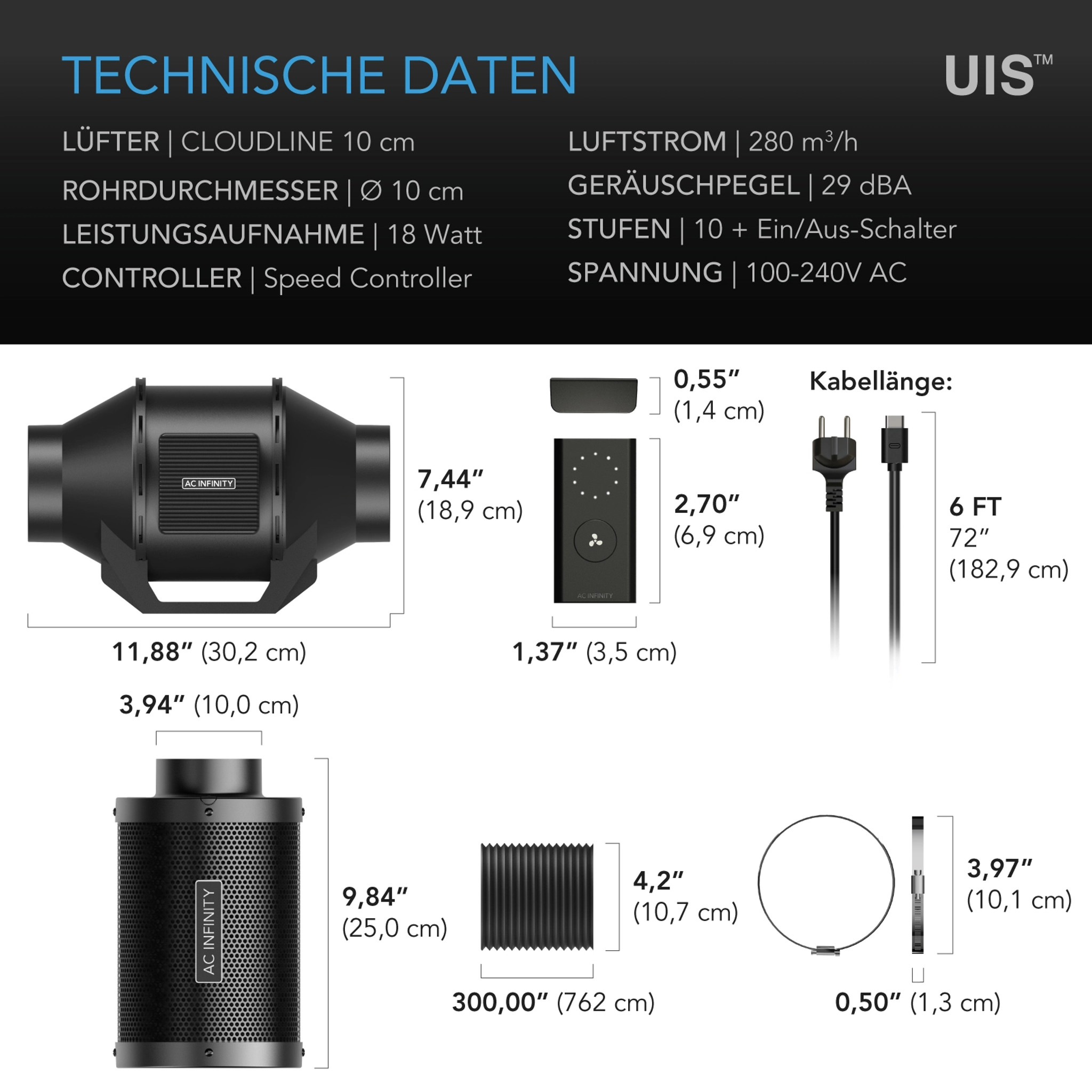 AC Infinity Luftfilterset 100 mm mit Inline-Rohrventilator und Aktivkohlefilter