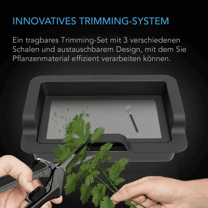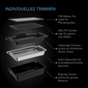 Dieses Trim-Tablett-System bietet eine durchdachte Kombination aus Präzision, Komfort und Effizienz. Hochwertige Materialien, ein flexibles 3-Tablett-Design und eine ergonomische Bauweise machen es ideal für professionelle Anwender und ambitionierte Hobbykultivierer. Perfekt, um bei jeder Ernte optimale Ergebnisse zu erzielen und wertvolles Pflanzenmaterial sauber und vollständig zu sammeln.