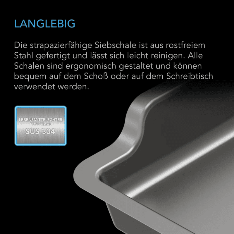 Das Set umfasst drei Tabletts sowie zwei austauschbare Siebeinsätze: einen 150 Mikron Edelstahl-Siebschirm und ein Sortiersieb aus ABS 757. Beide Einsätze lassen sich schnell wechseln, sodass du jederzeit zwischen feinem und grobem Material umschalten kannst. Die Edelstahloberfläche aus SUS 304 ist lebensmittelecht, leicht zu reinigen und ermöglicht die effiziente Sammlung feiner Partikel wie Pollen, ohne dass Material kleben bleibt.