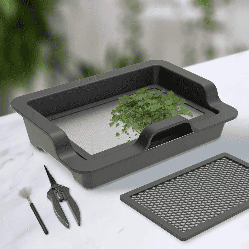 Das zusätzliche unbenutzte Tablett kann bei Bedarf als Stauraum für Pflanzenreste genutzt werden.