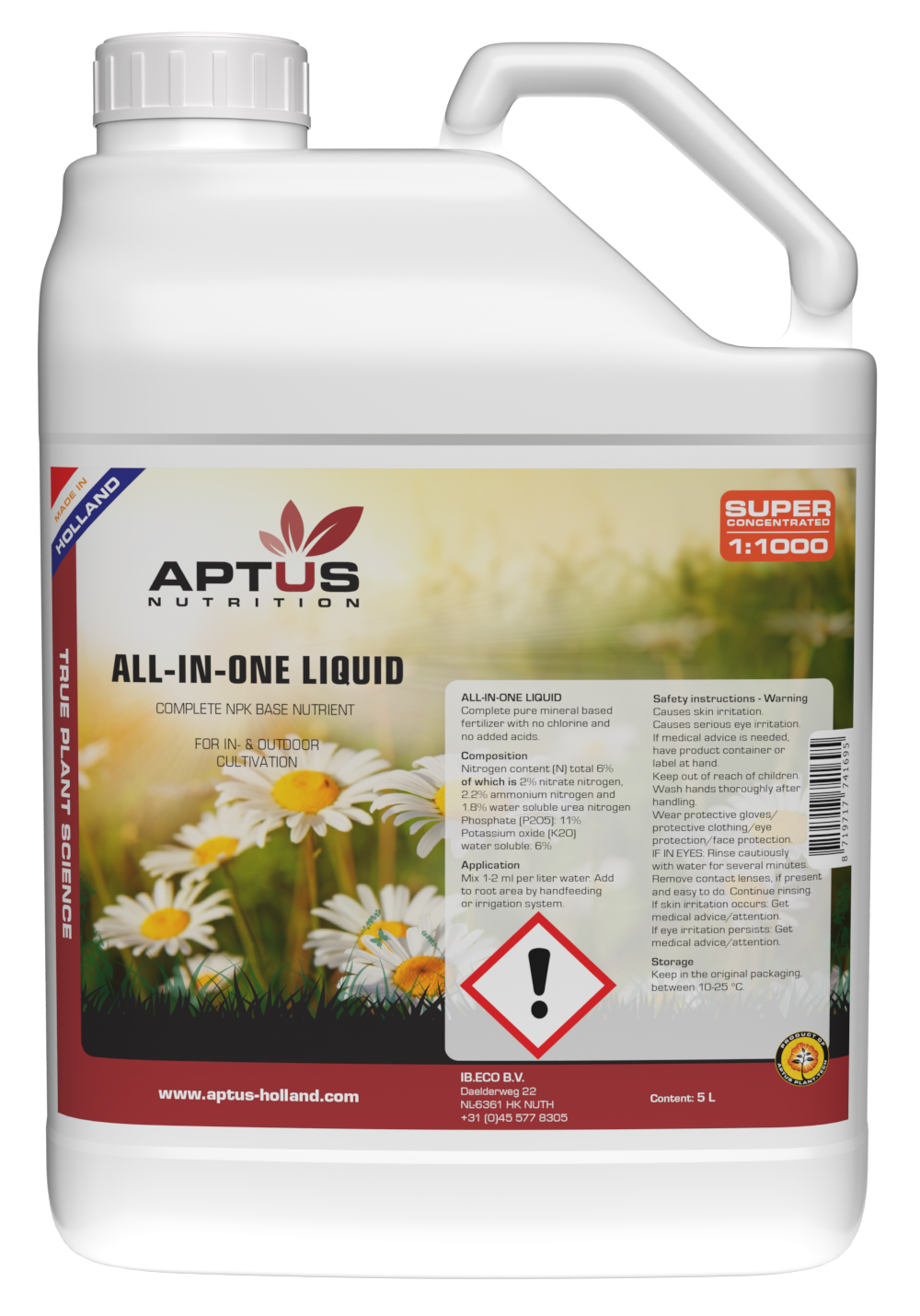 Aptus All-in-One Liquid 5 L ist ein vollständig mineralischer Flüssigdünger, der alle wichtigen Nährstoffe für kräftiges Wachstum und üppige Blüte liefert. Die konzentrierte Formel bietet maximale Leistung und ist für alle Kultursysteme geeignet.