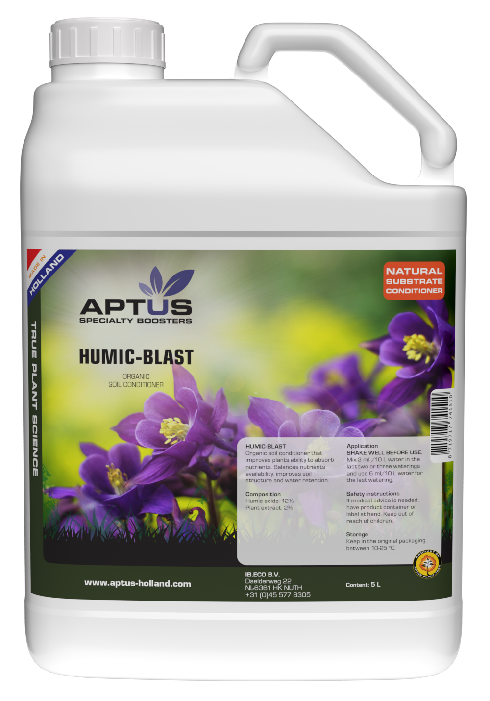 AptusAptus Humic-Blast 5 ltr ist ein natürlicher Bodenverbesserer mit Humus- und Fulvosäuren, der die Nährstoffaufnahme steigert, Salzablagerungen reduziert und das Wurzelwachstum fördert. Geeignet für Erde, Kokos und Hydrosysteme in allen Wachstumsphasen.