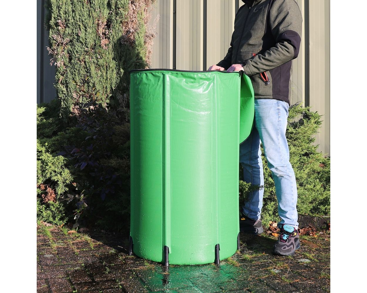 AquakingFaltbares Wasserfass 250 Liter aus UV beständigem PVC. Perfekt zum Sammeln und Nutzen von Regenwasser. Mit Reißverschlussdeckel, stabilem Gestänge und Auslaufhahn. Platzsparend und ideal für Garten und Terrasse.