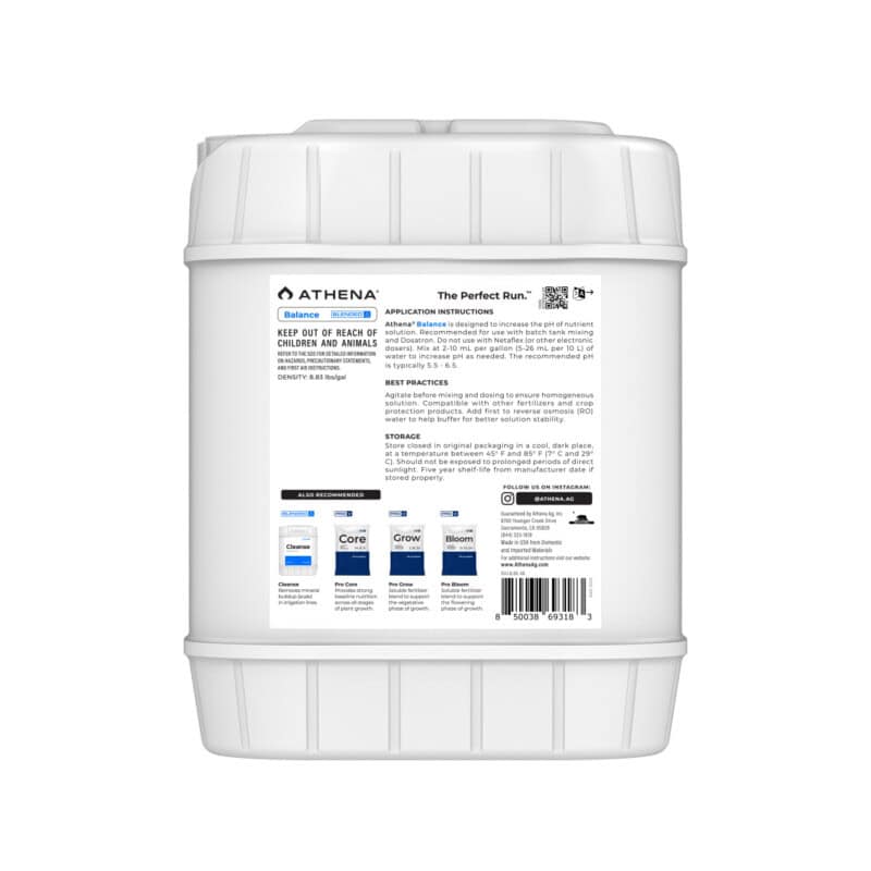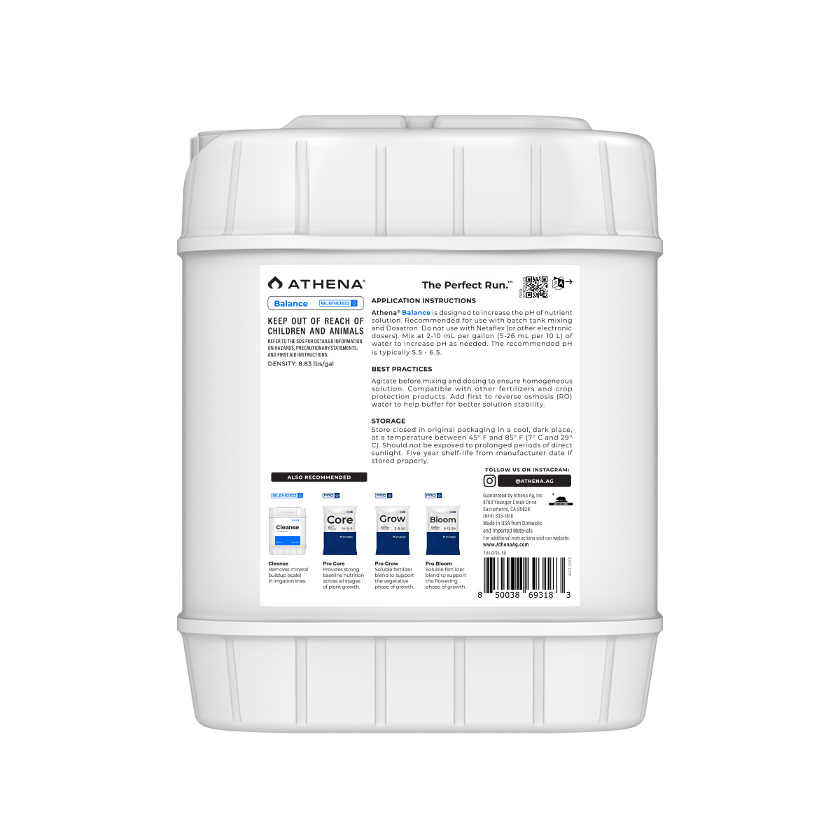 AthenaAthena Balance 18,93 L ist ein professioneller pH Puffer für Bewässerungswasser. Stabilisiert besonders Umkehrosmose Wasser, sorgt für homogene Nährlösungen und reduziert pH Korrekturen bei großen Wassermengen.