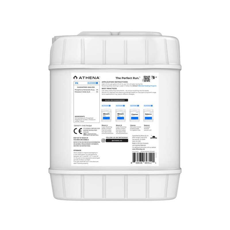 AthenaAthena PK 18,93 L ist ein sauberer, stickstofffreier PK Booster für die mittlere bis späte Blütephase. Liefert zusätzlich Phosphor und Kalium für maximale Blütenbildung, hohe Erträge sowie optimale Öl und Terpenentwicklung.