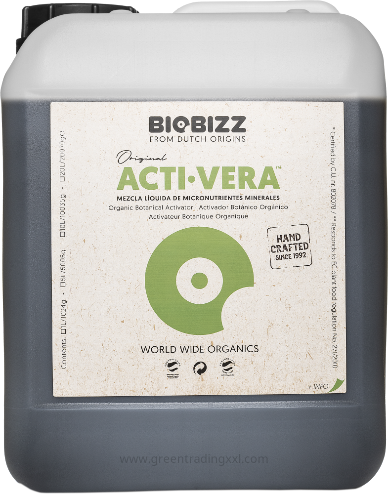 BiobizzBiobizz Acti·Vera 5 Liter ist ein 100% biologischer Pflanzenverstärker auf Aloe-Vera-Basis. Verbessert die Nährstoffaufnahme, stärkt die Abwehrkräfte und fördert ein gesundes Wachstum. Geeignet für alle Anbaumethoden.
