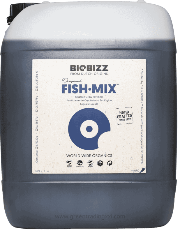 Biobizz Fish-Mix ist eine "biologische Bouillon" aus einer Emulsion von Nordseefisch, angereichert mit biologisch gewonnenem Zuckerrübenextrakt. Pflanzen lieben diese angereicherte Suppe. Sie aktiviert das mikrobiologische Leben im Boden und macht ihn "reicher" und "fruchtbarer", während sie die Pflanze gleichzeitig mit allen natürlich vorkommenden Mineralien versorgt. Neben der herkömmlichen Ernährung ist Fish-Mix ein ausgezeichnetes Produkt, um während der Wachstumsperiode als Blattspray auf die Pflanzen aufgetragen zu werden, was spektakuläre Wachstumsresultate zur Folge hat.