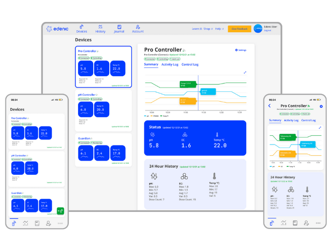 Dank der integrierten Wi-Fi-Funktion kannst du über die Edenic-Software deine pH-Werte in Echtzeit überwachen und steuern, egal wo du bist. Diese intuitive App bietet Benachrichtigungen, Einblicke und Steuerungsfunktionen, sodass du immer über die pH-Bedingungen deiner Anbauumgebung informiert bist.