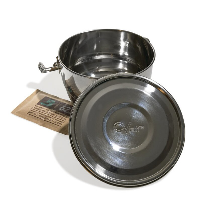 BovedaDer Boveda CVault Aufbewahrungsbehälter 2 Liter aus Edelstahl mit Silikondichtung und Boveda 62%-Pack ermöglicht eine luftdichte und optimale Aufbewahrung empfindlicher Produkte durch eine konstante Feuchtigkeitsregulierung bei 62 %.