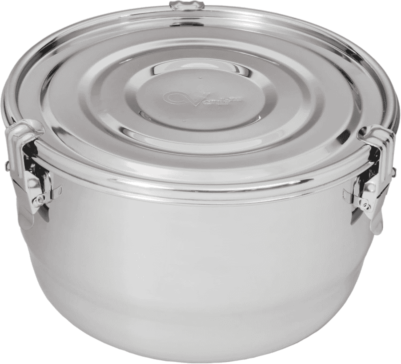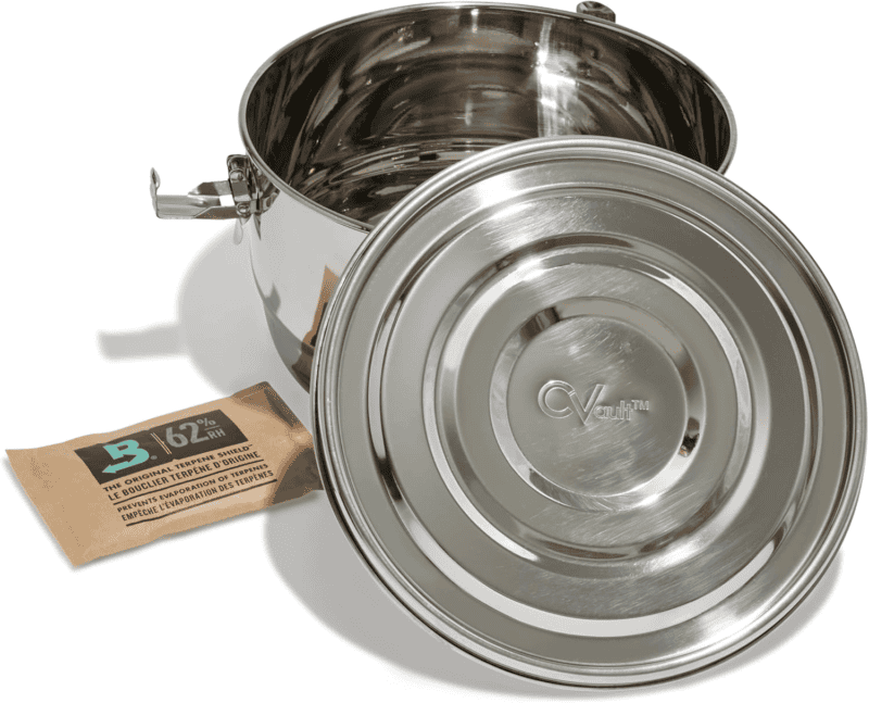 BovedaLuftdichte CVault Aufbewahrungsbox aus Edelstahl mit 4 Liter Volumen. Inkl. Boveda Humidipak 62 % zur Feuchtigkeitsregulierung. Ideal zur frischen Lagerung von Kräutern oder Ernte – ohne Geruchsverlust oder Schimmel.