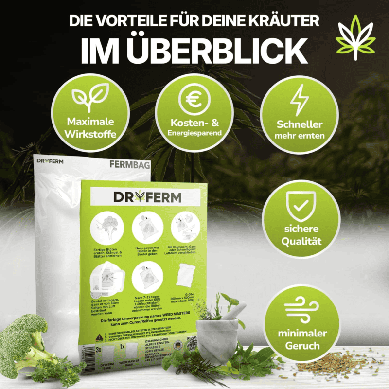 ✅ Erhält Aroma, Farbe und Qualität des EndproduktsDryFerm Bags lassen sich einfach aufhängen oder in Trockennetzen, Curing-Boxen oder Aufbewahrungsbehältern verwenden. Sie sind eine hervorragende Alternative zu Plastiktüten, da sie Kondensation und Aromaverlust vermeiden.