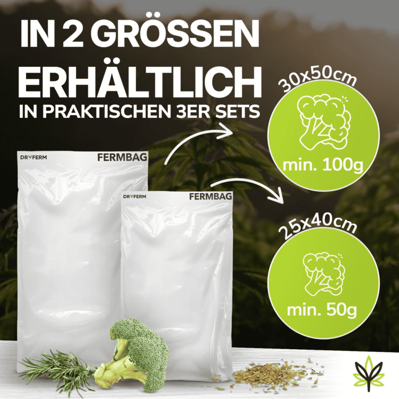 Atmungsaktive DryFerm Bags 25x40 cm für bis zu 50 g Kräuter oder Blüten. Ideal zum gleichmäßigen Trocknen und Lagern ohne Schimmel. 3 Stück pro Packung. Wiederverwendbar und luftdurchlässig.