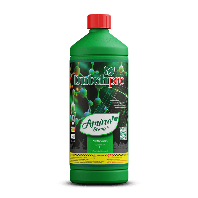 DutchPro Amino Strength ist ein konzentriertes wachstumsstimulierendes Ergänzungsmittel, das Aminosäuren und natürliche Pflanzenstärkungsmittel kombiniert, um Wachstum, Widerstandsfähigkeit und Ertrag zu verbessern. Dieses Produkt unterstützt die Entwicklung von starken Stängeln, einem gesunden Wurzelsystem und einer effizienteren Nährstoffaufnahme. Es hilft Pflanzen zudem, sich schneller von Stress durch Hitze, Beschneidung oder Umpflanzung zu erholen.