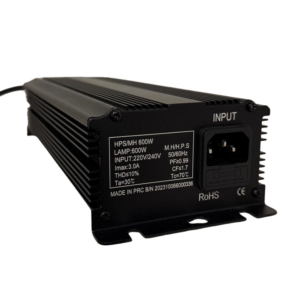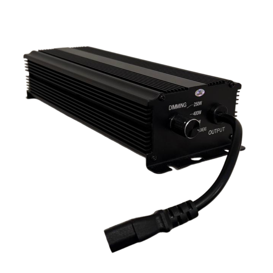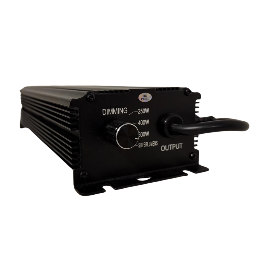 Dimmbares elektronisches Vorschaltgerät 600W mit 4 Stufen (250W, 400W, 600W, 660W Boost). Mit Schutz vor Kurzschluss, Lampenausfall und Überspannung. Spritzwassergeschützt, leise und effizient gekühlt. Inkl. 2 m Netzkabel.