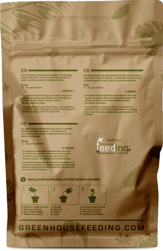 BioGrow wird direkt in die Erde oder das Substrat eingearbeitet. Die empfohlene Dosierung beträgt 3–5 g pro Liter Substrat, je nach Bedarf der Pflanzen und Wachstumsphase. Für beste Ergebnisse kann BioGrow in der Blütephase mit Green House Feeding BioBloom kombiniert werden.