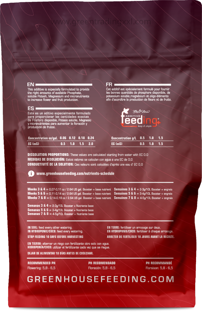 Der Green House Feeding Booster PK+ wird während der Blütephase eingesetzt. Mischen Sie 2-3 Gramm pro Liter Wasser, je nach den Bedürfnissen der Pflanze und dem verwendeten Substrat. Für beste Ergebnisse verwenden Sie das Produkt zusammen mit der Basisnahrung von Green House Feeding.