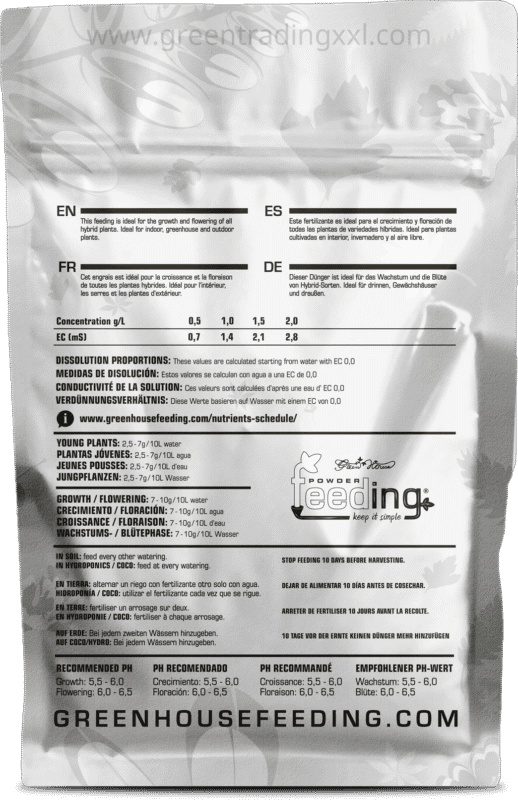 Mit einem optimierten NPK-Verhältnis von 15-7-22 bietet Green House Feeding Hybrids alles, was hybride Pflanzen für starkes Wachstum, gesunde Wurzeln und eine üppige Blüte benötigen. Dank des reduzierten Gehalts an ammoniakalem Stickstoff und des erhöhten Magnesiumanteils eignet sich dieser Dünger besonders für Hydro-, Kokos- und Aeroponiksysteme, kann aber auch problemlos in Erde verwendet werden.