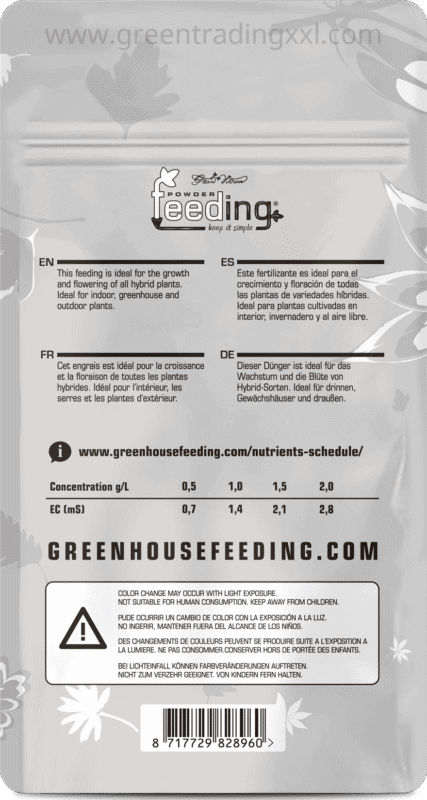 Dank der perfekt abgestimmten Makro- und Mikronährstoffe erhalten Pflanzen alle essenziellen Nährstoffe, ohne dass zusätzliche Komponenten erforderlich sind. Mit einem reduzierten Gehalt an ammoniakalem Stickstoff und einem erhöhten Magnesiumanteil eignet sich Green House Feeding Hybrids besonders für den Anbau in Hydro-, Kokos- und Aeroponiksystemen, kann aber auch in Erde verwendet werden.