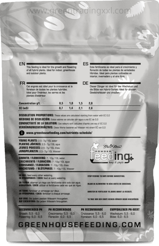 Green House Feeding Hybrids 500 g ist ein hochwertiger, pulverförmiger Pflanzendünger, der speziell für hybride Sorten mit einer Blütezeit von 8 bis 10 Wochen entwickelt wurde. Diese ausgewogene Formel versorgt Pflanzen während des gesamten Wachstums- und Blütezyklus mit allen essenziellen Nährstoffen, ohne dass zusätzliche Zusätze erforderlich sind.