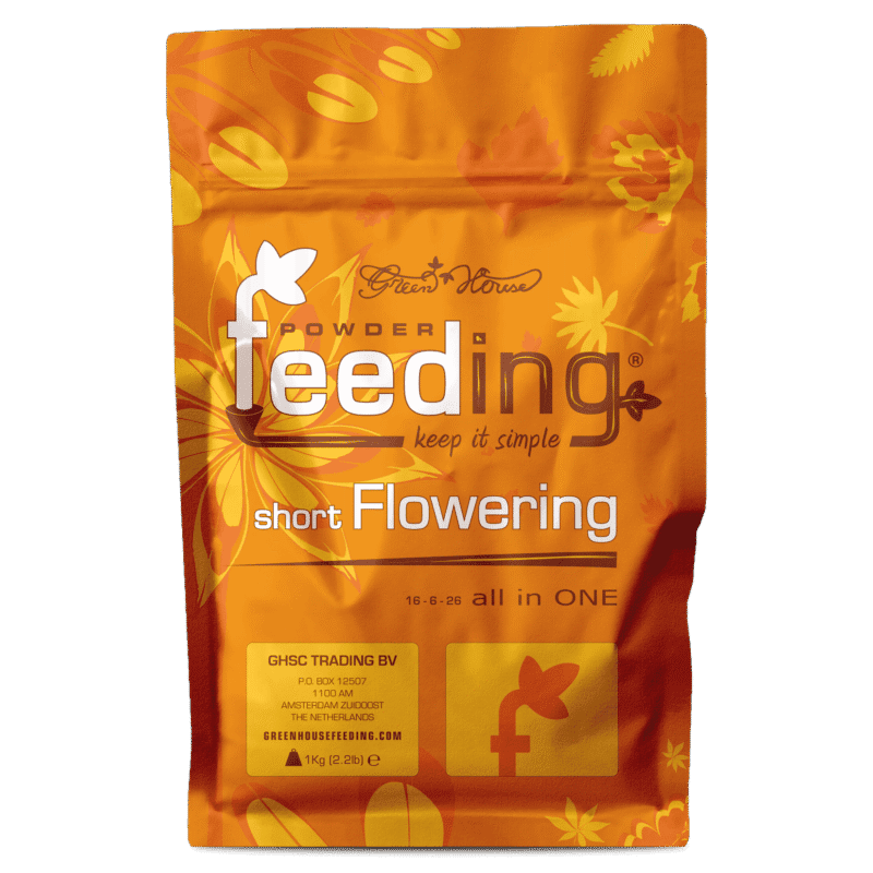 Green House FeedingGreen House Feeding Short Flowering 1 kg ist ideal für schnell blühende Pflanzen (≤8 Wochen). NPK 16-6-26 + Mg fördert starke Blüte und hohe Erträge. Für Erde, Kokos und Hydro. Einfache Dosierung, weniger Salzablagerungen, perfekt für jeden Grower.