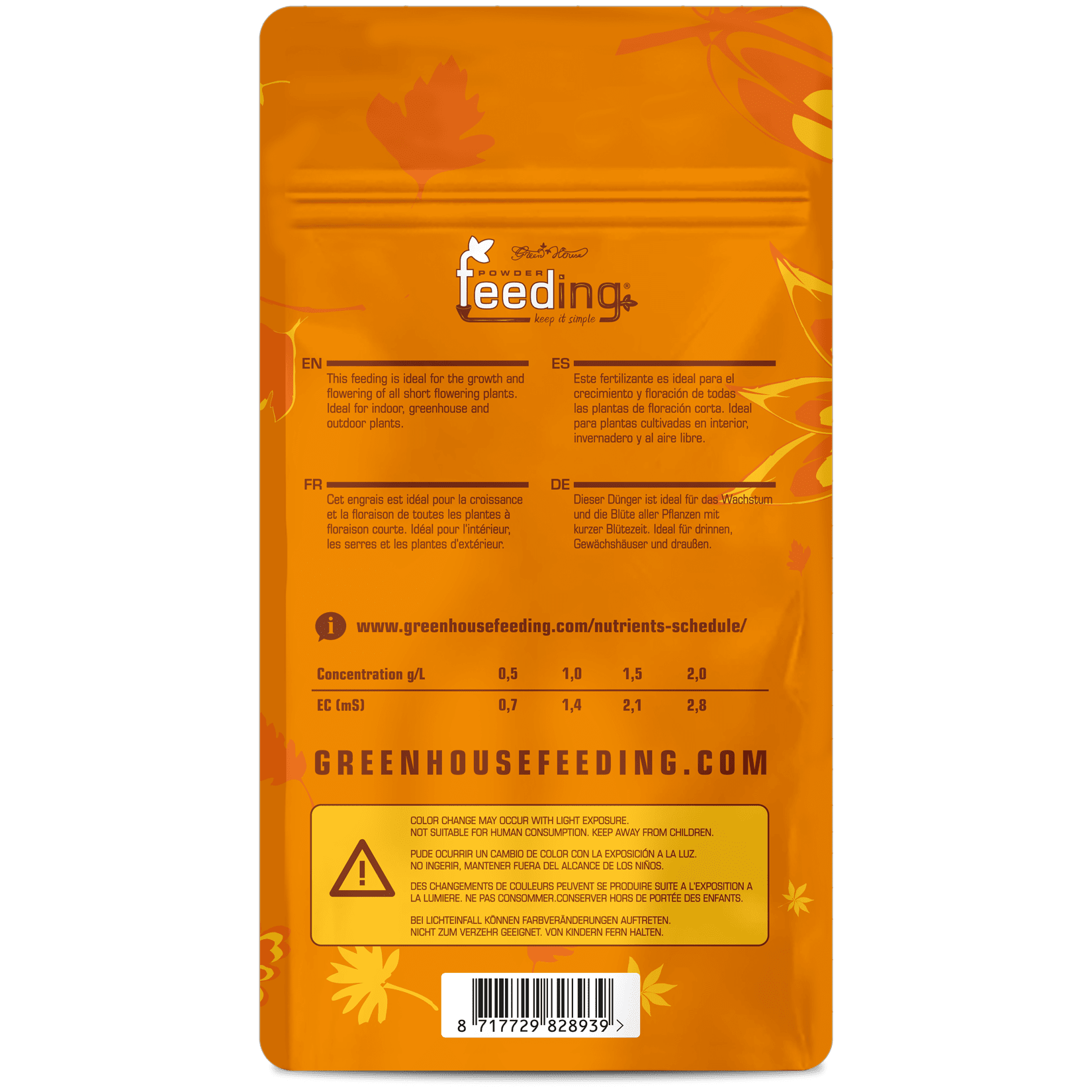 - Outdoor/extreme Lichtverhältnisse (+1000W): 1,5 g pro Liter Wasser. Verwenden Sie sauberes Leitungswasser (18-22 °C), kräftig mischen und die Lösung maximal 7 Tage in einem lichtundurchlässigen Behälter aufbewahren.