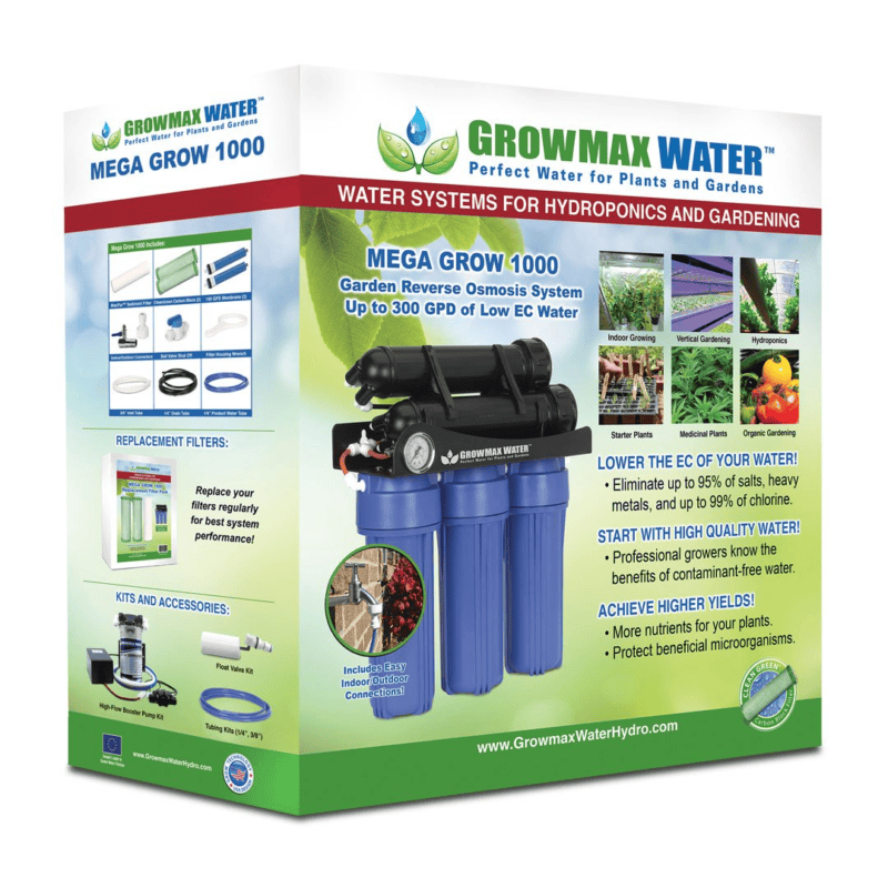 GrowMax WaterDas GrowMax Water Mega Grow 1000 Umkehrosmose System produziert bis zu 1.000 L reines Wasser täglich, entfernt 95 % Salze und 99 % Chlor. Perfekt für Gartenbau, Hydroponik, Hobbyanbau und Urban Gardening – für gesunde Pflanzen und starkes Wachstum.
