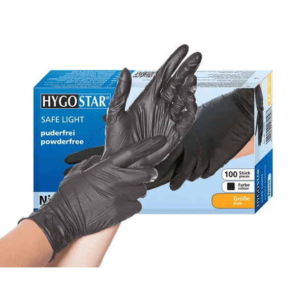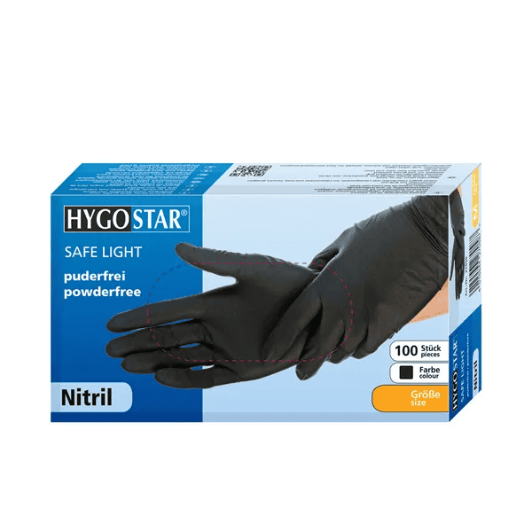 Schwarze Nitrilhandschuhe mit hohem Schutz vor Viren, Bakterien und Ölen. Puderfrei, latexfrei und mit texturierten Fingerspitzen für sicheren Grip. Komfortabel, robust und ideal für Gastronomie, Industrie und medizinische Bereiche.
