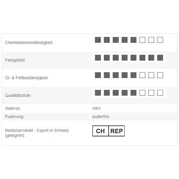 Die leichte Nitrilqualität ist besonders elastisch und passt sich angenehm der Hand an. Mit einer Reißkraft von mindestens 6 N und einer Dehnbarkeit von mindestens 500 Prozent bieten die Handschuhe eine hohe Flexibilität und Sicherheit. Sie sind hautfreundlich und latexfrei und daher ideal für Allergiker geeignet. Die optimale Wärmeableitung verhindert Wärmestau und sorgt für ein angenehmes Tragegefühl, auch bei längeren Einsätzen.