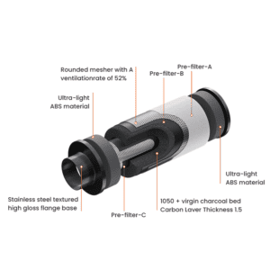 Die Kombination aus Premium-Aktivkohle und einem langlebigen Stahlgehäuse sorgt für dauerhafte Leistung und zuverlässige Filtration. Der mitgelieferte Vorfilter verlängert die Lebensdauer des Kohlekerns, indem er Staub und grobe Partikel zurückhält.