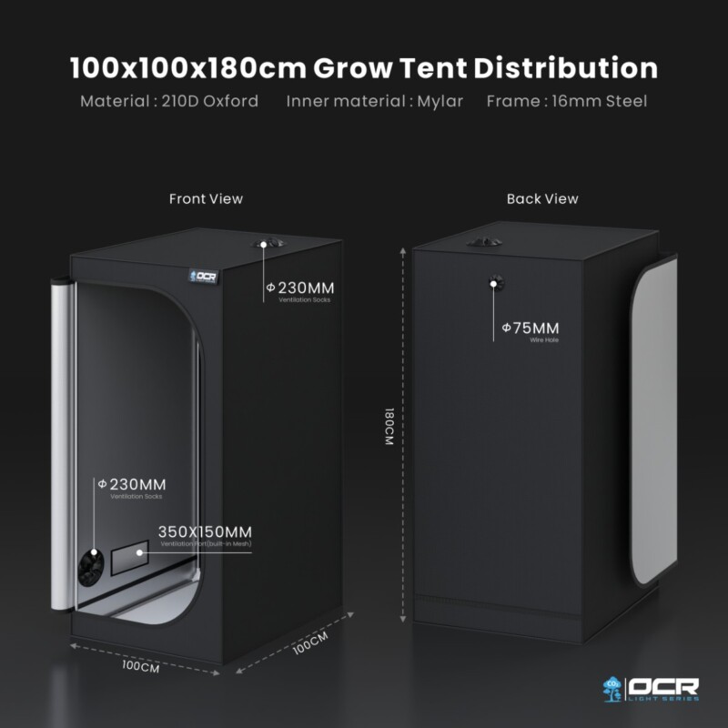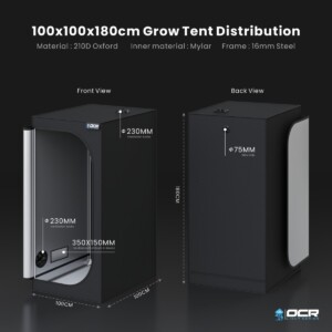OCRDie OCR Light 100 Growbox von 100x100x180 cm ist ein geräumiges Einsteiger-Growzelt mit 16 mm Rahmen und 210D Mylar-Innenbeschichtung. Ideal für kleine bis mittelgroße LED-Setups und effizientes Indoor-Growing mit großer Grundfläche.