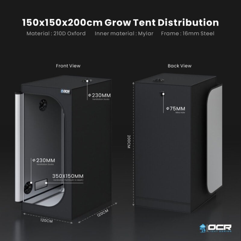 OCRDie OCR Light 150 Growbox von 150x150x200 cm ist ein geräumiges Einsteiger-Zelt mit 16 mm Rahmen und 210D Mylar-Innenbeschichtung. Ideal für mittelgroße bis größere LED-Setups und effizienten Indoor-Anbau ohne hohe Investitionen.