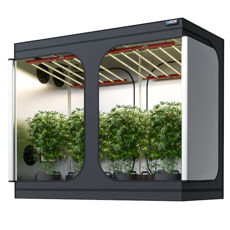 OCRDie OCR Pro 300L Growbox von 300x150x200 cm ist ein geräumiges, längliches Profi-Growzelt mit stabilem 22 mm Rahmen und langlebigem 600D Mylar-Gewebe. Ideal für mehrere LED-Lampen und große Indoor-Setups auf 4,5 m².