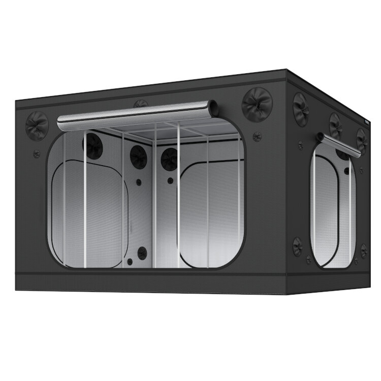 OCRProfessionelle Growbox von 240x360x225 cm mit 25 mm Heavy-Duty-Rahmen, bis 120 kg belastbar. Ausgestattet mit extrem dickem 1680D Mylar mit Diamond-Reflektion und wasserdichtem 0,6 mm PVC-Boden. Ideal für große, intensive Setups.