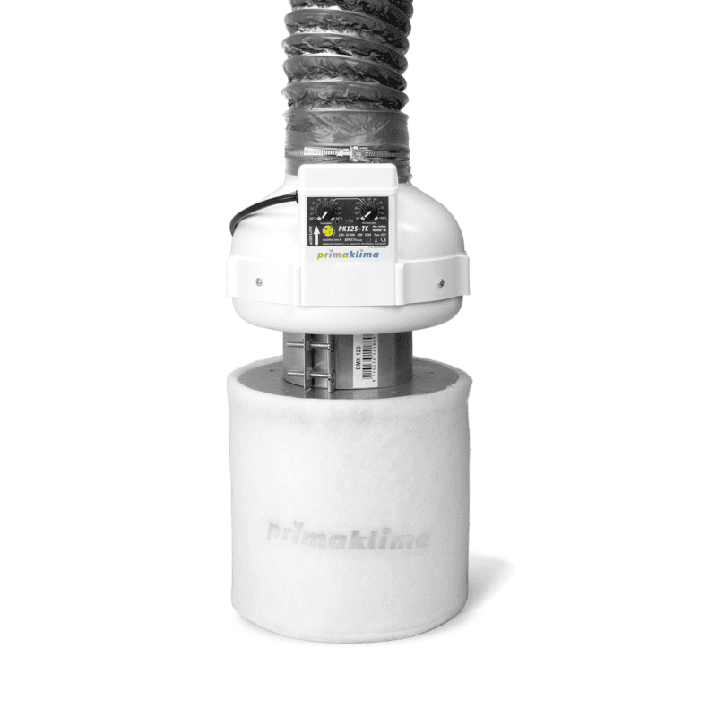 PrimaKlimaPrima Klima PKVS-125-TC Abluftset: Temperaturgesteuerter Ventilator (400 m³/h), Aktivkohlefilter (460 m³/h), Luftschlauch (3 m). Komplettsystem für optimale Belüftung und Geruchskontrolle in Grow-Räumen.